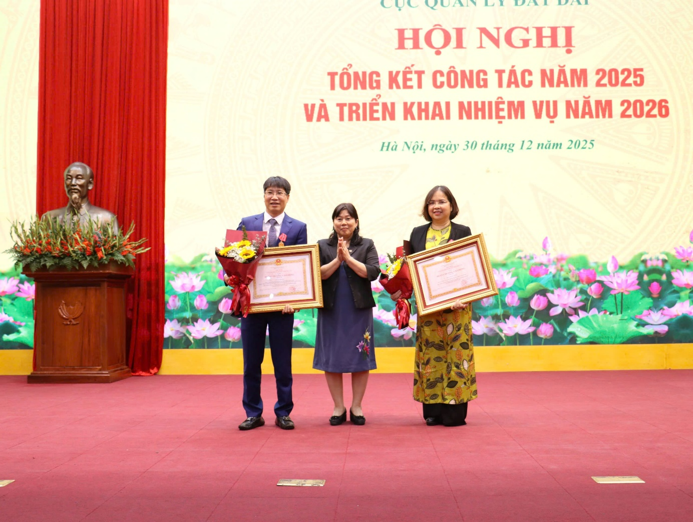 Thứ trưởng Nguyễn Thị Phương Hoa và Cục trưởng Đào Trung Chính trao Bằng khen của Bộ trưởng Bộ Nông nghiệp và Môi trường cho các cá nhân thuộc các cơ quan, đơn vị thuộc Bộ Nông nghiệp và Môi trường đã có thành tích xuất sắc trong công tác xây dựng chính sách, pháp luật về đất đai năm 2025